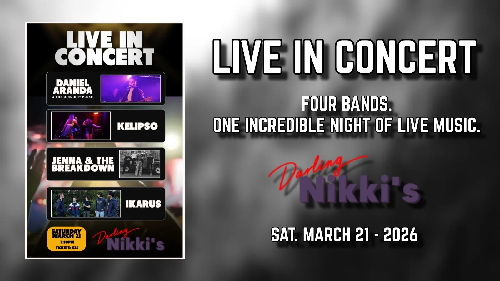FOUR BANDS … ONE INCREDIBLE NIGHT OF LIVE MUSIC! LIVE AT DARLING NIKKIS, SAT. MARCH 21!
